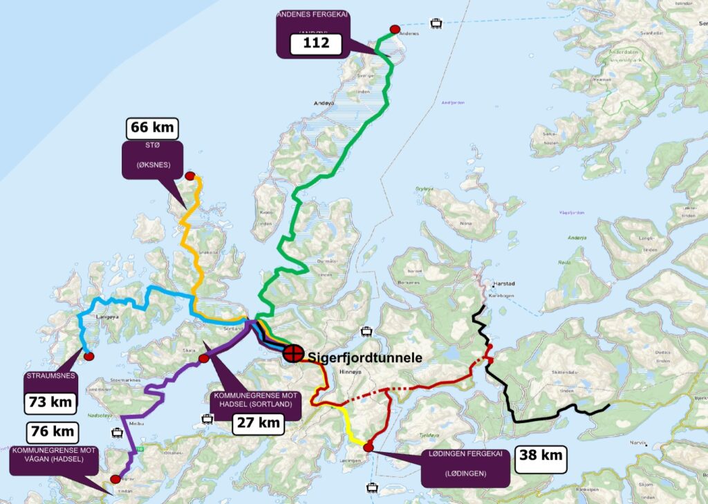 fylkeskommunal vei. De resterende ca. 62 km er statlig vei (E10 og rv.85). Sigerfjordtunnelen
